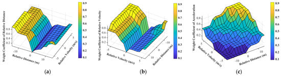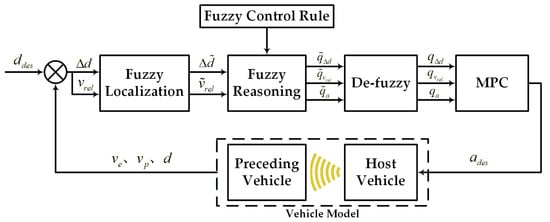 The inter-distance safety model is designed to provide a theoretical basis for the establishment of the upper-level control algorithm of the following mode of the ACC system of the DSV. Then, the objective function and constraints are established according to the four optimization objectives under the framework of the MPC, which are finally transformed into a quadratic programming solution problem with constraints [31]. Meanwhile, in order to ensure that the designed control algorithm can be adapted to the complex and changeable driving environment, according to the different focuses on different performance indicators, the weight coefficients in the objective function are updated in real time via fuzzy control on the basis of the MPC [32,33].