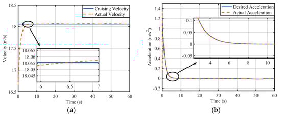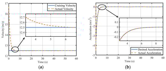 In this paper, the design parameters of the upper-level controller are tuned and adjusted, and finally determined as , , and . As a kind of ACC system working mode, the cruise mode is generally opened when the road conditions are good, there is no car in front, or the front car is far away. At the same time, comfort should be taken into account, so as to improve the acceptance and utilization rate of this working mode. According to the PID control principle, the desired acceleration will increase with the increase in the speed error, so it is necessary to limit the desired acceleration output from the PID controller. According to Payman Shakouri’s correlation analysis of the actual driving data and subjective evaluation, this paper sets the upper and lower limits of the desired acceleration as and , respectively.