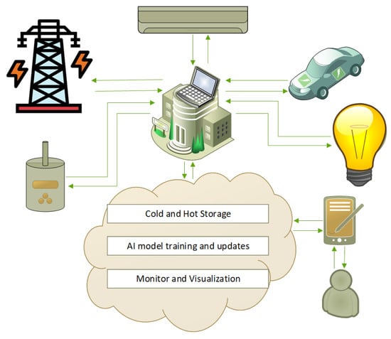 The concept of smart homes aims to not only create environmentally friendly buildings but also promote savings for both inhabitants and distribution network operators (DNOs). Smart buildings are enabled by technologies within the paradigms of the internet of things (IoT), as well as machine learning (ML) and deep learning (DL). IoT-based energy management systems (EMSs) combine sensors, communication protocols, and advanced learning algorithms for the collection of energy and data from homes or industries, enabling information-driven efficient energy use in buildings/homes [4,5,6,7,8]. Similarly, it is necessary to manage other scarce resources in buildings, houses, and industries. Generally, urban and industrial environments use similar technologies for the intelligent management of these resources, as is the case in intelligent water management [9]. Also, important services associated with human activity in buildings and homes are being planned using these technologies, as in the case of waste management [10,11] and garbage collection [12].