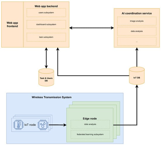- Edge layer: This layer is the data management system for the data ingested from the IoT layer, and it is responsible for preprocessing the data and applying artificial intelligence analysis to them. This makes it possible to later send the data to the cloud layer to ensure data persistence. The edge layer is housed in one or several computing nodes, deployed in several buildings’ rooms, close to the physical devices for data ingestion (probes with a set of integrated sensors). It is important to remark that the nodes described within this layer are called “edge nodes”, and in this category are the nodes deployed in the field in charge of centralizing the data intake. They correspond to the edge layer and contain the functionality needed to ingest the data sent by the IoT nodes; they preprocess the data, analyze it (using federated learning), and send it for storage in the cloud nodes.