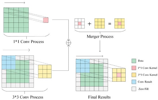 The fused convolutional layers are converted to Conv3×3, i.e., the convolution of specific different convolutional kernels are all converted to convolution with convolutional kernels of size 3 × 3. Since the whole residual block may contain both the Conv1×1 branch and identity branch, for the Conv1×1 branch, the whole conversion process is to replace the 1 × 1 convolution kernel with the 3 × 3 kernel, i.e., the value in the 1 × 1 kernel is moved to the centre of the 3 × 3 kernel, as shown in Figure 3. For the identity branch, this branch does not change the value of the input feature mapping, so we can set a 3 × 3 convolution kernel, and set the weight value at all 9 positions to 1. Then, it keeps the original value after multiplying with the input feature mapping. Merge the Conv3×3 in the residual branches and superimpose the weights W and bias B of all branches to obtain a fused Conv3×3 network layer after fusion.