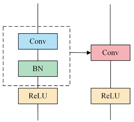For the merged convolutional layers, we fuse the convolutional and BN layers to perform accelerated computation operations in the training and inference phases. The strategy of fusing the convolutional and BN layers in a RepVGG block is mainly implemented by merging the convolutional and BN layers into a basic block. Each RepVGG block inside the module consists of two parts: one reparameterised convolutional layer and one nonlinear activation function, where the reparameterised convolutional layer consists of one 3 × 3 basic convolutional block and one BN layer, and after the nonlinear activation function in each block, we use the ReLU function. Specifically, as shown in Figure 4, each basic block consists of one normal convolutional layer, one BN layer, and one ReLU activation function, where the convolutional and BN layers are fused into a single learnable convolutional operation. During the training of the network, the gradient of the fused convolutional and BN parameters is simultaneously calculated and updated by the backpropagation algorithm of the network, thus enabling the end-to-end training of the network.