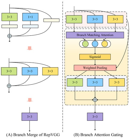 (2) Unique branch-matching strategy. In the process of merging the 3 × 3 branch, 1 × 1 branch, and residual branch into a single branch structure, we design different gating units to control the importance of the three branches, using global gating to adapt to the 3 × 3 branch and residual branch, and using local gating to adapt to the 1 × 1 branch. The simple add-and-merge method is cancelled, and the feature merging is performed by making full use of the image feature information extracted from the three branches, which improves the detection performance on two datasets, PASCAL VOC2012 and MS COCO2017.