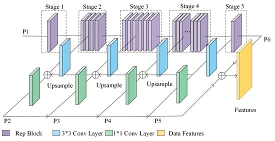 We divided the overall network into five stages after reparameterisation, and the image P1 input into the backbone network to extract features will gradually reduce the feature map size, and the final feature map used for detection tends to lose the detailed information of the large-scale feature maps due to the small scale. To be able to play a better role in general-purpose object detection, we add the FPN structure to the backbone network, which performs feature extraction on images of each scale and can produce multi-scale feature representations and feature maps of all levels with strong semantic information, even including some high-resolution feature maps. The structure of the backbone network combined with FPN is shown in Figure 7.