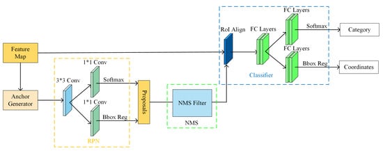 The RPN section in Figure 8 performs classification and regression operations on the multiple anchor frames generated at each anchor point. Specifically, after generating the anchor box, the feature map is fed into the RPN part, which first performs one 3 × 3 convolutional layer to keep the feature map size, and then performs the computation of two 1 × 1 convolutional layers to achieve the binary classification task and the border regression task, respectively. For each anchor frame, it is determined whether the anchor frame is a target object (foreground) or background. Then, a regression operation is performed to adjust the position and size of the anchor frame to better match the real position of the target object. We generate proposals based on the results of classification and regression. We employ the NMS algorithm to filter the proposals. Each box containing the target is sorted from highest to lowest according to the classification score. After sorting each box, we calculate the IoU value for each box and for each box, when its value is above a certain threshold, it is removed from the box. Finally, the result is fed into the classifier. IoU is a commonly used value in detection tasks, and is the result of dividing the overlapping part of two regions by the aggregated part of the two regions, and comparing the result of this IoU calculation by a set threshold value. Generally, we consider that an object detection is recognised when the IoU is greater than the threshold value.