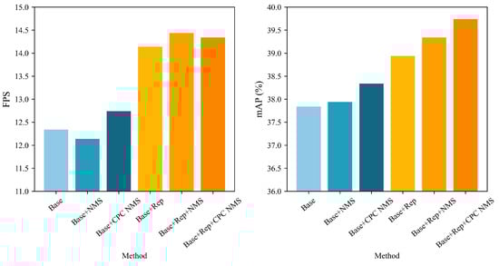 As can be seen from Table 1 and Figure 9, after using CPC NMS, the mAP of the model is improved compared to standard NMS. Compared with the standard NMS, after using CPC, it can improve the mAP while maintaining a certain FPS, which proves that our method is effective. Meanwhile, from the presentation of experimental data about reparameterisation, we can conclude that the network model with reparameterisation has reduced in terms of the number of parameters during the training period, which meets our expected criteria. In terms of mAP metrics and FPS metrics, it can be seen that the new model maintains better results. In particular, the model performance is significantly improved by the use of the reparameterisation approach and the CPS NMS strategy.