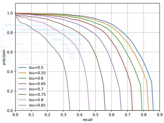 Different IoU thresholds were also used to compute the P–R curves in our object detection task, as shown in Figure 11.
