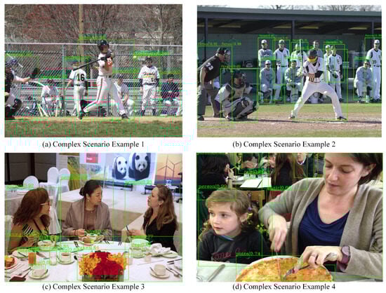 We visualised the detection results for the MS COCO2017 dataset. The four photos in Figure 12 show the results when the scene is more homogeneous and has less object detection, and the four photos in Figure 13 show the results when the scene is complex and has more object detection.