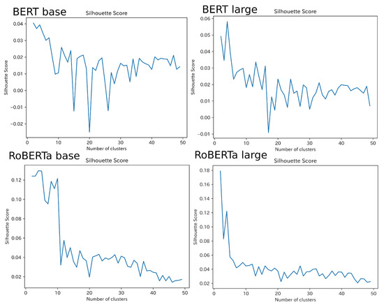 Silhouette analysis was performed on cluster counts ranging from 1 to 50 to better grasp clustering trends in the data. For all models, silhouette scores tended to decrease with the increasing cluster count. With the RoBERTa models, a drastic drop-off in silhouette score was seen within the first 10 cluster sizes, whereas the BERT models decreased less dramatically. Moreover, while all four models displayed a degree of saw-like peaks and valleys, RoBERTa models produced much smoother silhouette score curves than the BERT models. The BERT-base in particular experienced an intermediate period of sharp rises and falls, even into negative values, before completing the analysis cycle near the top of the score range.