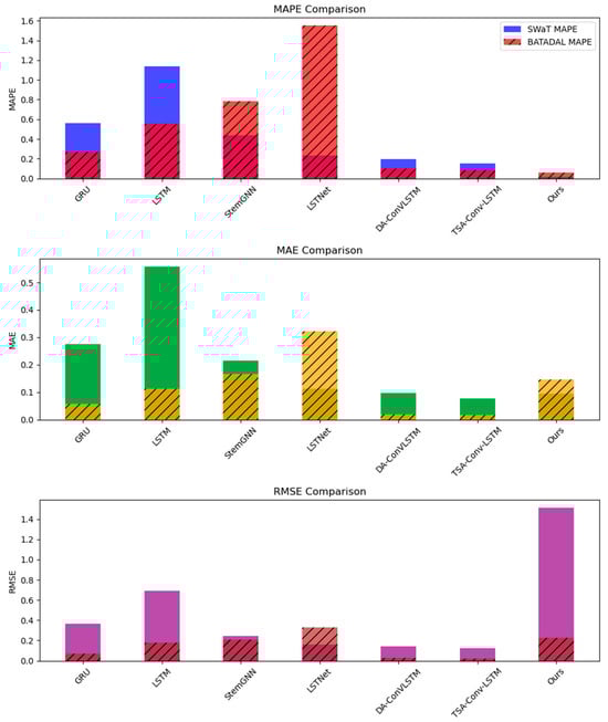 In our paper, we followed the authors’ training procedures in [31] and [7] but increased the number of iterations from 300 to 2000. The baseline models in the original papers used 256 LSTM units, but we used lighter units of 64 to capture temporal correlations. Our results in Table 3 were remarkable, with excellent MAPE, MAE, and RMSE metrics in Figure 3 and Figure 4, indicating high predictive accuracy. However, our proposed model showed a weakness in the SWaT dataset, particularly in terms of RMSE.