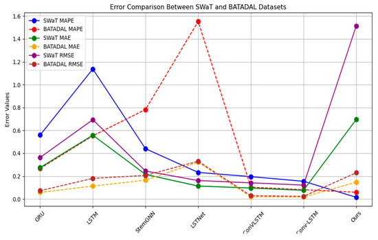 To evaluate the LSTM network’s ability to recognize temporal relationships in multivariate Digital Twins, we conducted an assessment using the SWaT and BATADAL datasets. As depicted in Figure 3, when comparing error rates between the datasets, a significant distinction becomes apparent between the baseline and our model. MAPE and MSE demonstrate promising results in reducing the error rate disparity, with differences of less than 0.2 when compared to the six baseline models. However, RMSE exhibits some weaknesses in terms of error rates between the datasets.