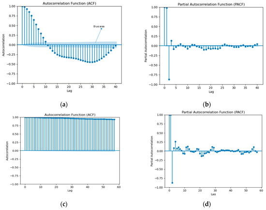 Representations of an autocorrelation analysis in identifying lags of the target instances: (a,b) the BATADAL dataset with ACF and PACF; (c,d) the SWaT dataset of the target variable using ACF and PACF, respectively.