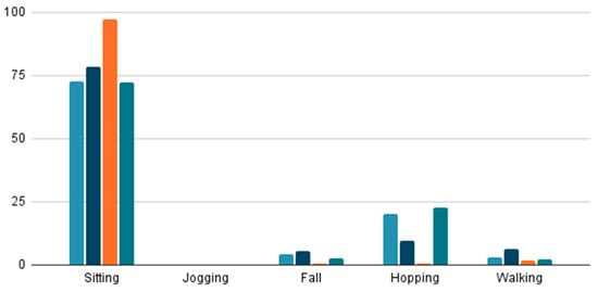 In Table 2, it can be observed that the CNN model outperforms the Bi-LSTM models. This means that the model could better discriminate all activities from the DatasetUniba and UnimibShar datasets, even similar activities such as falling and sitting. Thus, CNN, as the best-performing model, was used to perform activity prediction with the dataset “Dataset questionnaire experiment” to analyze activity predictions by class. The results by classes of interest are illustrated in Figure 1, Figure 2, Figure 3 and Figure 4. In Figure 1, Figure 2, Figure 3 and Figure 4, the color legend in the graphs is as follows: Bullying (Gray), Victims of bullying (Blue), cyberbullying (Orange), and Victims of Cyberbullying (water green).