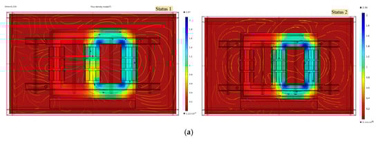 The magnetic flux density and the magnetostriction of the transformer silicon steel sheet are strongly correlated; the higher the flux density, the stronger the magnetostriction. The transformer flux density diagram for both states is shown in Figure 9a. The maximum value of the main flux density of the transformer in both modes is more than 2.0 T, which is outside of the normal working range of the transformer. The main flux density of this transformer is approximately 1.7 T when operating under normal conditions. The transformer’s stress distribution is depicted in Figure 9b, and the transformer winding exhibits varying degrees of deformation in both modes. With the study in Figure 9a,b combined, it is clear that the transformer’s aberrant vibration characteristics in both modes are caused by internal mechanical flaws.