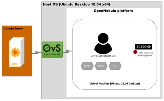 During data collection, we used our integrated platforms of OpenDaylight and OpenNebula [22]; then, we created an Ubuntu 16.06 desktop virtual machine within OpenNebula, as shown in Figure 2.