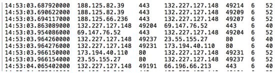We used the output of the lsof command to label the experiment packets with their corresponding applications. However, to extract the flow information, we worked directly on the PCAP files (Figure 3) by using tcptrace [24]; then, we labeled each flow with its application by using the lsof output. At the end of the experiment, we obtained two files: a PCAP one containing the packet information and another containing the output of the lsof command. From the PCAP file, we extracted the packets’ time, source address, source port, destination address, destination port, protocol, and length in bytes.