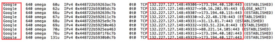 From the lsof output (as shown in Figure 4), we extracted the application name, its source address, source port, destination address, destination port, and protocol.