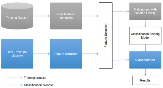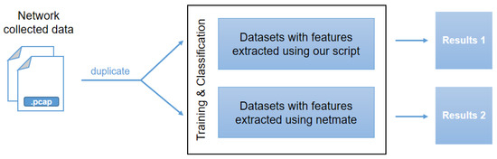 Furthermore, to take a deep dive into our results, we ran the same tests for a second iteration by changing the features that we selected. This time, we used the Netmate [32] tool, which generated a set of default features provided by the tool [33]; then, we used this set of features as the flow attributes on which to base the classification with the same four algorithms. Figure 6 illustrates the steps of our methodology.