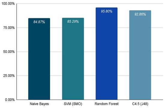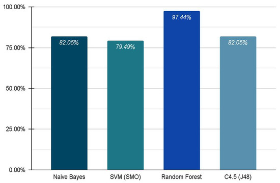 All classifiers were tested with the trained data. Figure 7 shows the results for the accuracy of the different algorithms that were tested on the first set of features under study based on Equation (1):