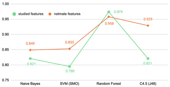 To sum up the obtained results, we can say that Random Forest showed the best results for both applications with both feature sets, but the results were more significant with our studied and selected features, which gave the highest accuracy. The accuracy obtained in our tests was as efficient as that stated in previous papers on SDN traffic classification [2,6,7,8,9]. However, the remaining three algorithms—SVM, Naive Bayes, and C4.5—were able to better classify the network flows of our dataset when using the Netmate features. In the experiments in [5], Random Forest and C4.5 were also the classifiers that gave the best accuracy, while SVM did not show good results when using Weka. In addition, the authors of [7] claimed that of all of the proposed methods for classifying traffic in SDNs, theirs gave the highest accuracy (97%), similarly to the results in this paper with the Random Forest algorithm (97.44%). In [6], the authors included a study about the appropriate number of features to use for better results, and they concluded that the number should be equal to or higher than eight features, which was the case in our experiments. The Netmate features (44 in total) were four times more numerous than those that we selected (nine features). Most papers using supervised learning have stated the use of the Netmate features for their classification studies, but did not compare them with other sets of features. Their comparisons were only based on the chosen algorithms’ metrics (i.e., accuracy, recall, precision, etc.).