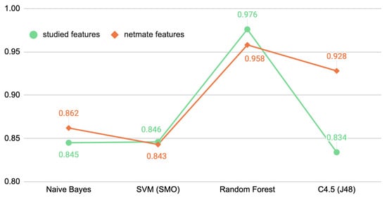 On the other hand, we found that Naive Bayes and C4.5 (J48 in Weka) showed exactly the same average recall when classifying our data and a small difference in precision when it came to the studied features. However, with the Netmate features, C4.5 showed a higher precision and recall—over 0.9—which explained the increased accuracy of the classifier with this set of features. The same went for Naive Bayes, with a smaller difference in the metrics between the use of the two different sets of features.