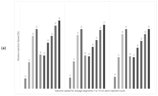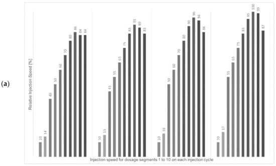 The PPU’s algorithm was set up with the dosage length divided into 10 segments. Each segment length was adjusted considering the melt required to fill the sprue as well as the filling of the cavity. The screw positions defined and the relative injection speed imposed for each dosage segment are represented in Figure 8.