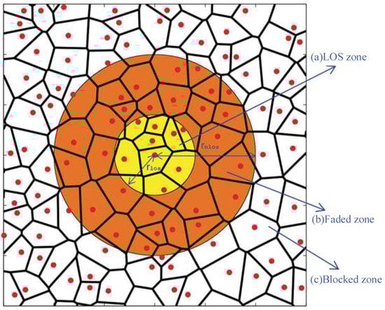 A typical wireless communication network. Red dots represent the BSs, while those thick-black lines symbolize the polygon cells. This network is made up of three specific areas: (a) LOS area is the inner circle; (b) Faded or NLOS area is those annular regions with orange color; (c) Blocked area is those regions which are outside the colored circle [4].