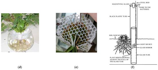 Non- destructive methods: (a) Internal growth Method; (b) Container Method; (c) Isotope Probing Method; (d) Soilless Cultivation Method; (e) Mesh bag Method; (f) Minirhizotron Method. [5,6].