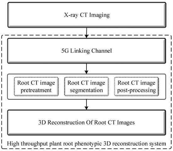 This paper proposed a high-throughput method for plant three-dimensional root reconstruction based on X-ray CT three-dimensional root tomography technology to boost the research on the 3D reconstruction of root phenotyping of plants. The article took advantage of the characteristics of fast data transmission speed and large throughput of 5G wireless transmission links which can effectively reduce the time of image data transmission between the imaging terminal and the lower computer in the image transmission.