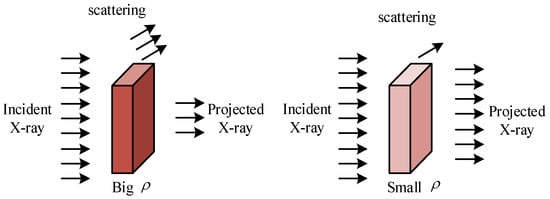 In Equation (1), I0 is the intensity of the incident X-ray (i.e., the transmitting energy); the index of I is the intensity after transmission (i.e., the receiving one) that was passing through a uniform density object; μ Is the linear coefficient of the substance to the wavelength; d is the path length through a uniform density object, and e is the natural logarithmic base. As seen from the equation, because the value of μ depends upon X-ray energy, atomic coefficient, and density of matter (as shown in Figure 5), there is a much larger D or μ and much smaller I0 the larger the fading of X-rays is. In it, D represents a uniform distance of parameter d.