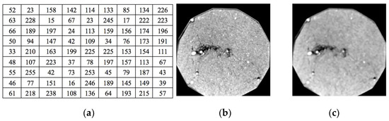 CT images of the fault of soil roots: (a) 9 × 9 filtering template of the median filter; (b) original image; (c) filtered image.