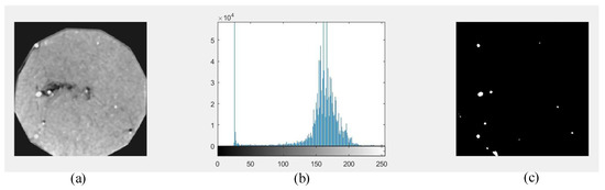 Threshold segmentation: (a) filtered image; (b) the histogram; (c) segmented image.