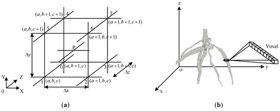 Voxel used in the algorithm is the smallest unit of data in three-dimensional space. As shown in Figure 12a below, the space coordinates of eight vertices defining each voxel are , , , , , , , , respectively. Figure 12b also illustrates the tomographic slice voxel sequence in its right one.
