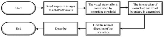 The moving cube algorithm can extract a series of isosurfaces from a three-dimensional data field. Figure 13. above illustrates the algorithm flow of the moving cube. In the process of this method, process the voxels in the data field one by one firstly, and classify the cubes intersecting with the isosurface secondly. Finally, calculate the intersection point between the isosurface and the cube edge by interpolation, based on the relative position between every vertex and the isosurface. It considers an isosurface the approximate representation. This isosurface is generated by connecting intersection points between an isosurface and the cube edges.
