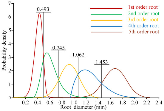 Figure 15 above illustrates the result for the method of five root orders. According to the method of the five root orders mentioned above, we can define and distinguish that the root orders from first- to fifth-order, respectively, denote five stages of the plants: Emergence, Full cover, Anthesis, Maturity, and Harvest. As found from the figure, those solid profiles with the different colors represent the functions of the probability distribution structured by diameters, respectively, corresponding to these first through fifth orders of the root of plants. The cross values of these probability functions distribution curves of the diameter of the two nearly root orders are only the threshold of this diameter interval. Regarding the diameters corresponding to the cross units of the probability distribution lines upon these five orders for the roots of plants as segment threshold values of next near order roots, these thresholds for those diameters from first- to fifth-root orders are 0.478 mm, 0.732 mm, 1.062 mm, 1.453 mm, and more than 1.453 mm, respectively.