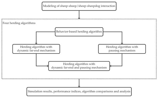 In this paper, inspired by real-world sheepdog herding behavior, four behavior-based herding algorithms are proposed for the social force model-based sheep herd. The research flowchart of this paper is shown in Figure 1.