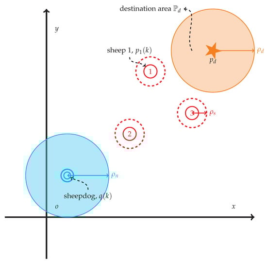 An example of the herding problem with 3 sheep, denoted by red circles with labels, and 1 sheepdog, denoted by a blue circle. The destination area (in orange) is centered at .