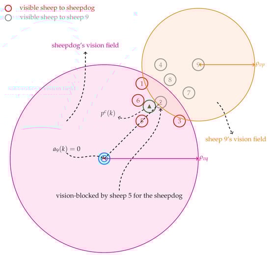 The above definitions are illustrated by an example shown by Figure 3, where sheep 2 is vision-blocked by sheep 5 for the sheepdog. In this scenario, , , and .