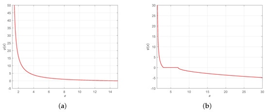 Plots of functions and . (a) Plot of with , , . (b) Plot of with , , , , .