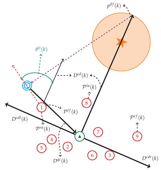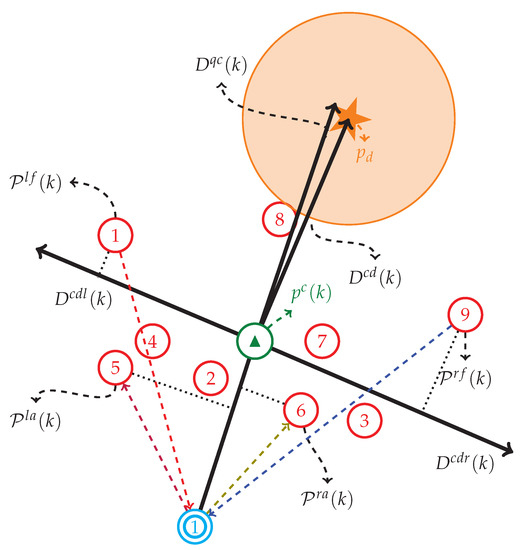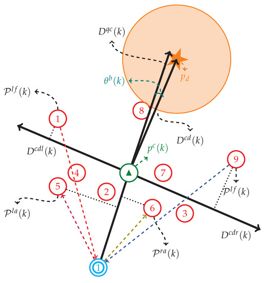 Below we make some explanations for Algorithm 1. To begin with, we check the algorithm termination condition, i.e., the step limit is hit, or the herding task is fulfilled. If neither of these conditions is satisfied, the algorithm continues, calculating the next move for the sheepdog. The basic idea of the herding algorithm, like in [19,20], is to let the sheepdog move behind the sheep herd in a side-to-side manner, forming a repeated semi-circle route. While different from the existing results, we do not set external steering points or milestones outside the sheep herd to achieve side-to-side motion, but use critical sheep as temporary reference points. By doing so, the sheepdog shall stick to the contour of the sheep herd, which would greatly reduce the odds of sheep herd fragmentation due to improper route of the sheepdog as mentioned in [19,20]. In general, there are two main issues to address. First, how to make the sheepdog stick to the contour of the sheep herd? We solve this issue by defining anchor sheep, which are dynamically changing as the sheepdog moves. When the sheepdog uses these anchor sheep as reference points, the detouring angle makes the route bend in the direction of outliers, thus preventing the sheepdog from breaking into the sheep herd directly. Second, how to determine the turning point for the sheepdog? The turning behavior is activated when two criteria are met simultaneously. On the one hand, the entire sheep herd is on one side of the line connecting the sheepdog and the far end of the destination, which is chosen to be the destination center in Algorithm 1. On the other hand, the turning angle should be small enough, less than the turning-angle threshold . In Algorithm 1, the state-flag is used to identify the moving direction of the sheepdog at step k.