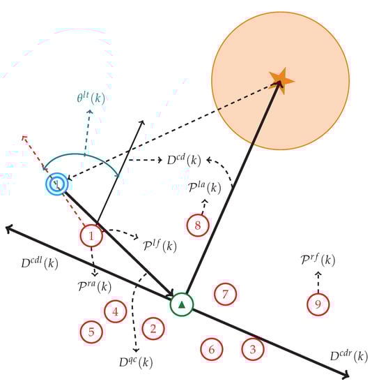At step k, for the sheepdog, if sheep i is not vision-blocked by any other sheep, and satisfies where denotes the perceptive radius of the sheepdog, then sheep i is called visible to the sheepdog. Let denote the label set of all the sheep visible to the sheepdog at step k.