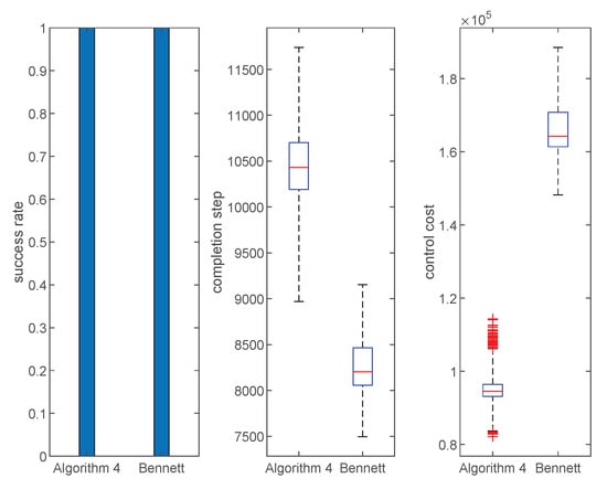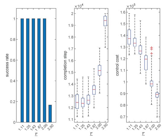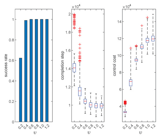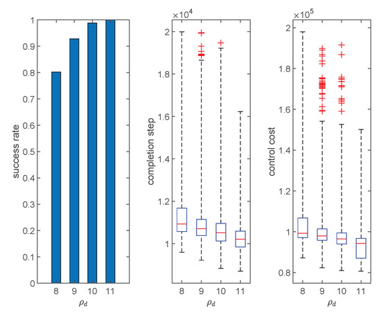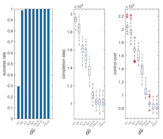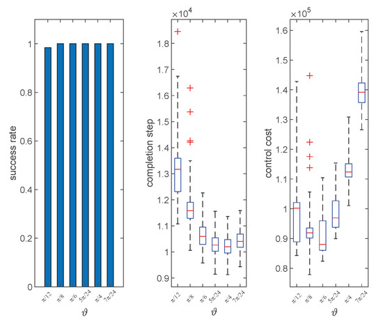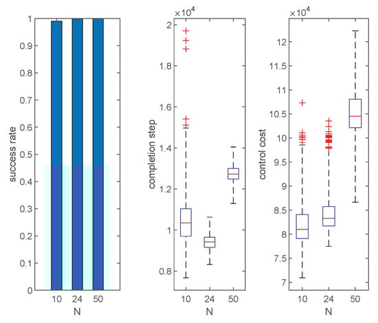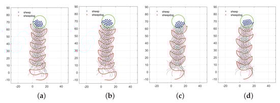 In this section, we will test and analyze Algorithms 1–4. First, we will show the typical herding process under Algorithms 1–4. Next, we will evaluate and compare the performance of Algorithms 1–4 from three aspects, namely, success rate, completion step, and control cost. Finally, we will perform parameter analysis to see how different parameters will affect the performance of the proposed algorithm.