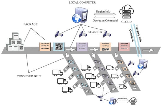 It can be seen from Figure 1 that the sorting operation depends on the QR code. Combined with QR code technology, it is possible that logistics companies then implement the unmanned management of sorting and package tracking. The accuracy and speed of QR code recognition will directly affect sorting efficiency. However, in complex environments, QR code recognition is often affected by other factors, such as uneven lighting. There are several ways to deal with this factor. Wellner [5] proposed a method that used an average of surrounding pixels as a threshold to segment the image. Sauvola [6] devised a way of utilizing the average and deviation of gray values in an area to set the threshold. Zhang and Yang [7] proposed an improved algorithm based on that of Sauvola to speed up the calculation process, but the size of the processing window limited the algorithm. Di et al. [8] proposed an improved method based on Wellner’s, and the results can be obtained through simple calculations. However, the algorithm is not effective in the case of severe unevenness of light. Yang and Feng [9] came up with an algorithm combining the methods of Bersen [10] and Otsu [11]. The algorithm will modify the threshold to prevent misclassification. However, several parameters in the algorithm need to be set manually, lacking some adaptive ability. Wu et al. [12] found a method of using BTC to segment an image into multiple blocks for binarization. This method is computationally intensive, and its effect depends on the number of segmented blocks. Chen et al. [13] proposed a window-adaptive binarization algorithm before; the proposed method has a favorable adaptive ability. The algorithm meets the requirements of the warehouse sorting systems, but it cannot meet the needs of the logistics sorting system because the automatic scoring in the logistics system has a higher requirement for efficiency.