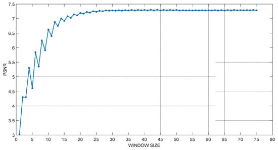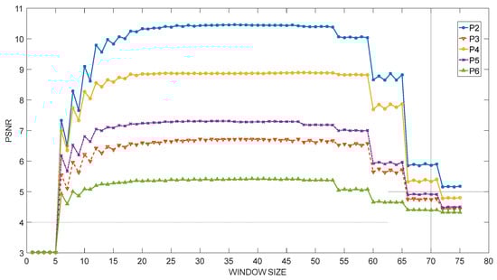 In order to solve the problem of window size selection, we performed a series of studies. Initially, we processed the QR code image P1 (Figure 4) with a size of 300 × 300 and iterated from a window size of 1 pixel until the window size was 1/4 of the image width. When the window size exceeds 1/4 of the image width, this will be too time-consuming to use in reality. Sauvola’s algorithm was used for binarizing the QR code image. After obtaining several binarized QR code images after processing, we used two objective quality evaluation standards, peak signal-to-noise ratio (PSNR), to judge the results. The larger the calculated value of the evaluation standard, the higher the image quality after binarization. Based on the evaluation of the processed pictures, we have drawn Figure 5.