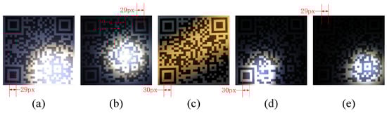 In the QR code, the information is encoded in a binary representation. As shown in Figure 2, the dark modules, or black modules, usually represent “1”, while the light modules, or white modules, often represent “0”. In the upper left, lower left, and upper right corners of the QR code are the position detection patterns. When the mobile device detects the three modules, it can determine the position and direction of the QR code and prepare for decoding. The three position-detection patterns in the QR code have the same size and are composed of three concentric squares. The width ratio of the dark module to the light module of the position detection pattern is 1:1:3:1:1.