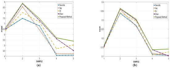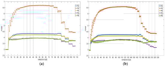 PSNR value curves of five samples in the same size: (a) 300 × 300; (b) 450 × 450.