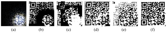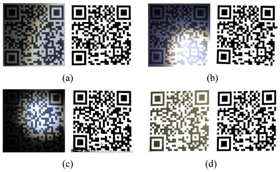 - Figure 16 shows the effect of different algorithms in processing the QR code. Two strong lights focused on the QR code made it have different illumination acquisition in different areas.