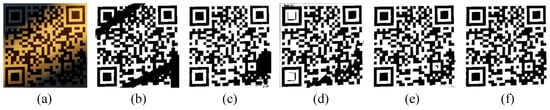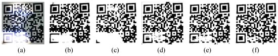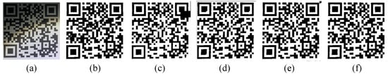 - Zhang, Y.; Gao, T.; Li, D.; Lin, H. An Improved Binarization Algorithm of QR Code Image. In Proceedings of the 2012 2nd International Conference on Consumer Electronics, Communications and Networks (CECNet), Yichang, China, 21–23 April 2012; IEEE: Piscataway, NJ, USA, 2012; pp. 2376–2379. [Google Scholar]