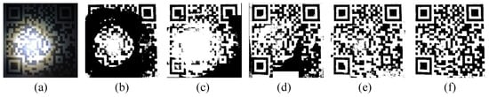 Under complex lighting conditions, the traditional global binarization algorithm lacks advantages in recognition rate. At the same time, the traditional local binarization algorithm is also not ideal for processing speed and image segmentation effect. In order to accurately binarize QR codes under complex illumination, many researchers have proposed their methods. Zhou et al. [16] made improvements based on Sauvola’s method, combined with the QR code feature definition parameter R in Equation (3). However, the problem of defining the window size was not resolved. Zhang’s team [17] proposed an improved binarization method based on background grayscale. This method combines the joint interpolation algorithm and uses the Otsu method to segment the image. Nevertheless, the effect is general in the case of multiple light sources. Yao’s team [18] proposed an algorithm that fuses the improved Niblack algorithm with Otsu’s algorithm. The algorithm is faster than traditional local binarization methods but is not able to binarize QR code images under different degrees of uneven illumination.