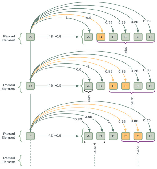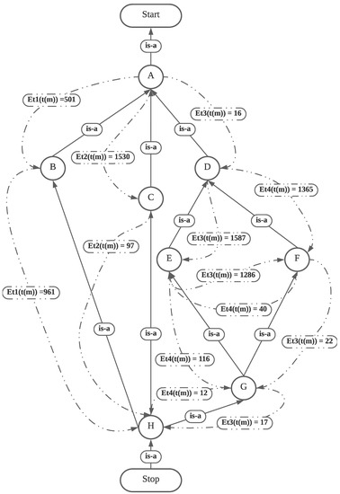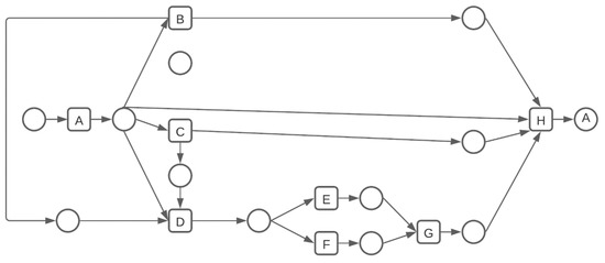 The following cases are observed in Table 1: ; ; ; —cases 1 to 4, respectively. We might discover the following details about the process by examining these four cases. The underlying process comprises eight activities . Activity H is always the last activity that must be performed; activity A is always the first to be completed. Activities can be performed after A is finished in any order. H is instantly executed when activities B or C are done, as indicated in cases 1 and 2. Activities E and F can be performed in no particular order after activity D. In this case, both E and F are concurrent. Activities E and F are connected directly by G. Activity H is performed after completing B, C, or G. to are set of places of a Petri net represented by circles As shown in Figure 1, a Petri net (see definition in Section 3.1) may mimic the four event-log scenarios listed in Table 1. A significant field of study that creates an effective tool for text comprehension is the measurement of the semantic relatedness between phrases.
